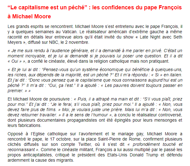 “Le capitalisme est un péché” : les confidences du pape François à Michael Moore