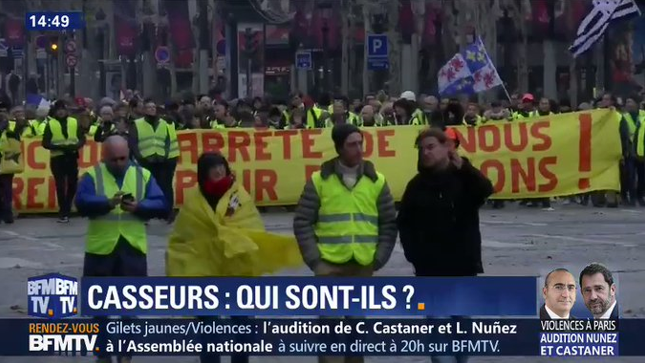 "Tous portent des gilets jaunes mais leurs profils sont disparates. Sur ces images, ce sont des militants de l'extrême droite" : le 3 décembre 2018, BFM TV revient sur les images de la mobilisation des Gilets jaunes, qui manifestent depuis plusieurs semaines contre la hausse du prix des carburants et la baisse du pouvoir d'achat. Alors que les différents rassemblements, notamment à Paris, ont été émaillés de violences, plusieurs responsables politiques ont pointé du doigt la responsabilité dans ces incidents de l' "extrême droite", voire même de la "peste brune".