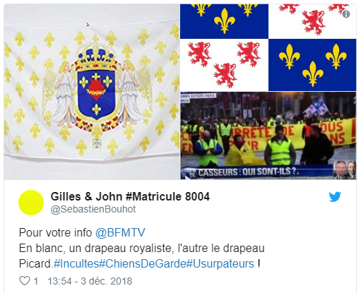 Et Sylvain Boulouque, présenté comme spécialiste des mouvements sociaux, d'analyser les images choisies par la chaîne d'information en continu : "On voit un slogan hostile au gouvernement. Et deuxième chose, on voit surtout un drapeau avec des fleurs de lys, qui illustre la monarchie et la volonté d'un retour du roi."