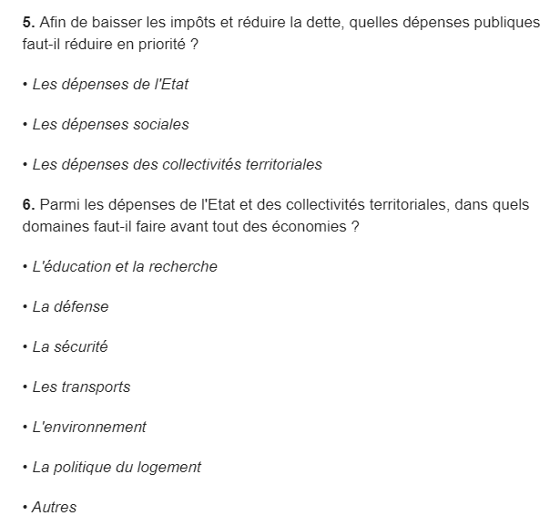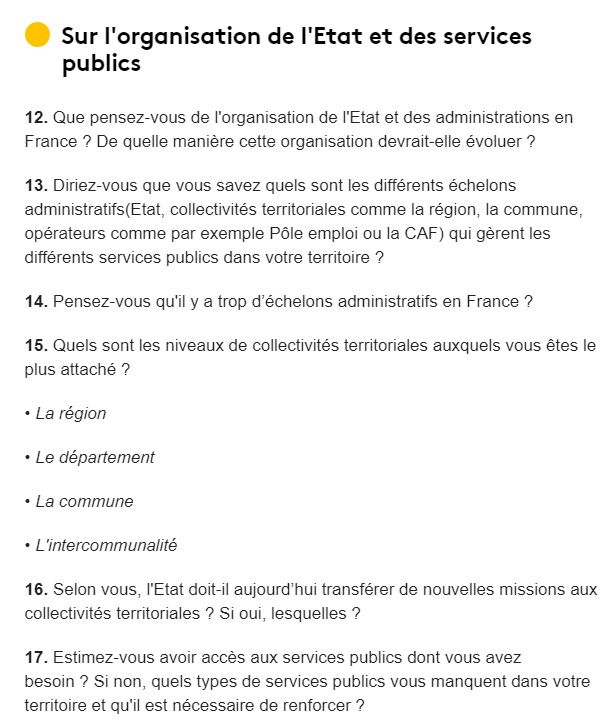 Les fiches mises en ligne sur le site internet du grand débat national proposent 82 questions sur les thèmes de la fiscalité et les dépenses publiques, l'organisation de l'Etat et des services publics, la transition écologique et la démocratie et la citoyenneté.