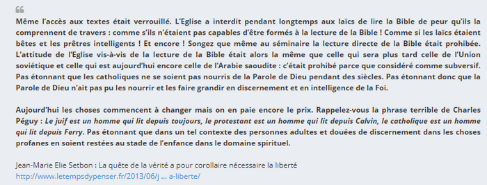 Dans cette lettre de Pie IX (1846), on y trouve la condamnation des " perfides sociétés bibliques qui répandent parmi les fidèles les moins instruits les livres des saintes écritures traduits en toute espèce de langues vulgaires et souvent expliquées dans un sens pervers . . . les répandant partout gratuitement ". |