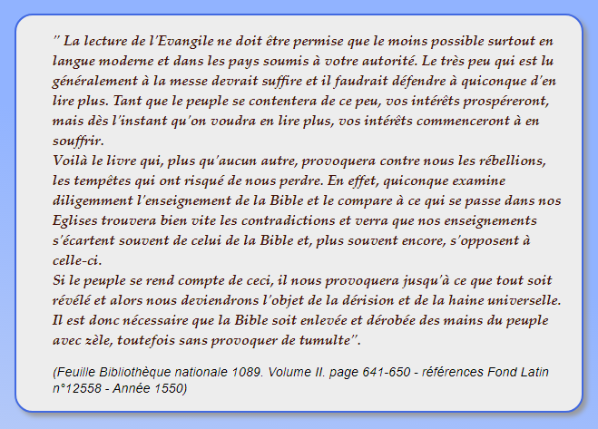 Le concile de Toulouse a eu lieu en 1229. Le canon 14 interdit aux laïcs la lecture et la possession de la Bible, à plus forte raison en langue vulgaire. |